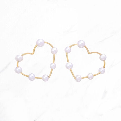 ハートのラインにぽんぽんとパールが散りばめられた直結タイプのピアスシャープな印象の角線でハート型を作り、耳につけると少し斜めを向く角度に仕立てることで、甘さを抑えた大人のためのハートモチーフが完成しました。