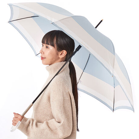 [型番:1JI11049-49]シンプルなカラーブロックのプリントが凛とした魅力を引き出す雨傘。ツイル生地による程よいツヤ感があり、上品さを醸し出している逸品です。耐風仕様の骨を使用しているので、強い風にも安心してご使用いただくことができます。