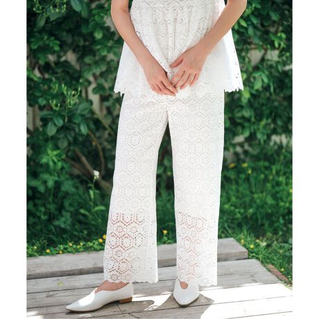 クラフト感のあるかぎ編み風のレースをふんだんに使用したレースパンツ。