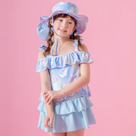 胸元フリルに肩リボン、ボトムスにはティアードスカートを合わせたガーリーなセパレート水着は、