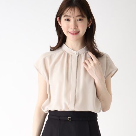 バイカラーフレンチスリーブブラウスバンドカラー【イージーケア洗濯機洗い可】
