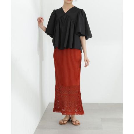[型番:1663220653]裾まわりの透かし編みがシーズンライクなポイントのニットレーススカート。ストンとした縦のラインを演出し、様々な透かし編みとフリンジのおかげで足元に軽い抜け感をプラスします。ジレジャケット×Tシャツ、シアーシャツ×タンクトップ、ボリューム感のあるフェミニンブラウスなどと、雰囲気をかえて着回しがきくのもポイントです。