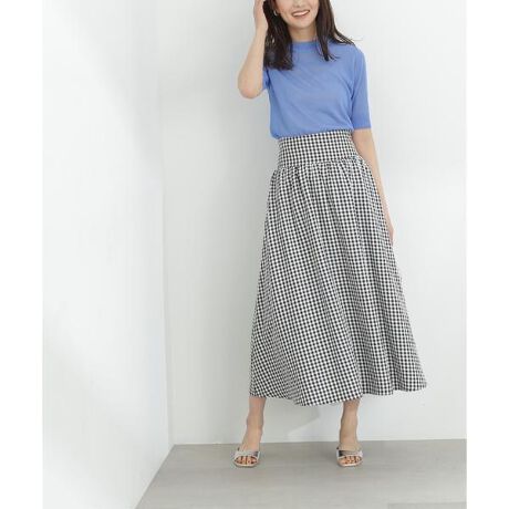 小柄のギンガムチェックが大人っぽい印象のギャザースカート。ウエストベルト部分を幅広でとり、スッキリとしたウエストラインに見せてくれます。後ろウエストはゴム仕様で、おさまりよくフィットしながら着用できます。ギャザーをあしらったフレアシルエットで存在感は抜群。ベーシックなニットやシンプルなTシャツなどを合わせれば、季節のコーディネートに映える一枚です。