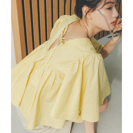 後ろ姿をかわいらしく見せるバックリボン付きブラウス。袖は大胆なバラフライスリーブがポイントになり、腕をほっそり見せてくれます。前後であけたVネックで顔まわりをすっきりと見せ、身頃はゆとりのあるシルエットで着心地も良いです。Iラインのスカートやトレンドのデニムパンツとのコーディネートがお勧めです。【Designer's Voice】腕まわりをつつみこむようなふんわりとしたバタフライスリーブのブラウスです。ギャザーをたっぷりと入れてボリュームを出しています。軽い素材にのせているので、重たい印象にならないように仕上げております。【Fabric】薄手のシャツ素材を使用