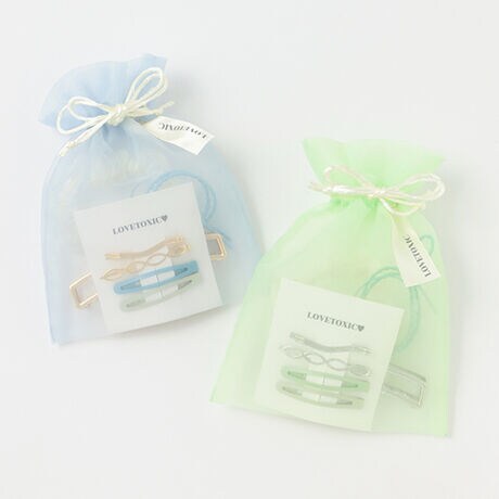ヘアアレンジが楽しくなるアクセサリーセットです。ヘアピン、ヘアクリップ、ヘアゴムをたっぷりと揃えました。形や色味も変えているので、その日の気分に合わせたスタイリングが可能。シアー素材の巾着つきのため、プレゼントにもおすすめです。