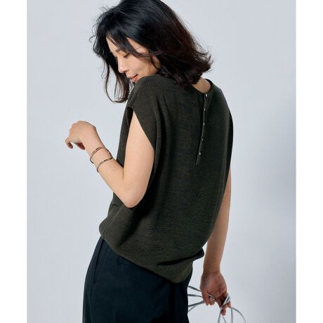 背中のゴールドボタンがアクセントの、ラウンドボートネックのプルオーバーです。ゆったりと着られるオーバーサイズシルエットで、幅広く体型をカバー。シャリッとした肌触りだから、汗をかきやすい真夏も一日中気持ちよく過ごせます。どんなボトムとも相性が良く、夏のデイリーに欠かせない1枚です。カラーは合わせやすいベーシックなブラック(#005)、ベージュ(#533)、肌なじみの良いオレンジ系のキャメル(#034)、今年大人気の紫系では、落ち着いた色味ながらも鮮やかなパープル(#080)、柔らかい印象のライラック(#082)、さらにニュアンスのある糸で奥行きを出したカーキ(#554)の6色展開です。