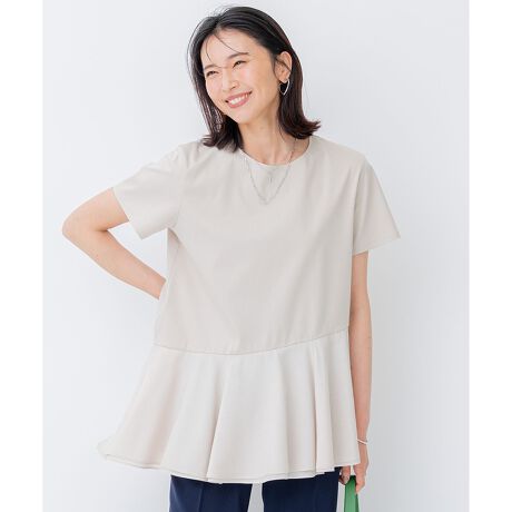 裾ペプラムをアシメトリーに切り替え、フェミニンになりすぎず着やすいデザインに。シアーな素材を2枚仕立てにしているので、程よいボリュームで、気になるヒップ周りもカバーしてくれる1枚です。カラーは合わせやすくシックなブラック(#005)、肌なじみの良いベージュ(#033)、洒落感をプラス出来るカーキ(#054)の3色展開です。