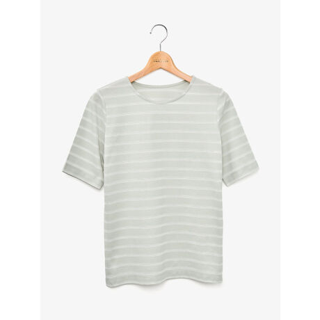 ホワイトのポリエステル糸でややシアー感のあるボーダーラインを入れたオリジナル素材。ジャガードの手法で地柄見えの生地に仕上げ、1枚で着ても存在感のある素材です。生地の価値感を活かし、形はシンプルはTシャツ型に。カジュアルなボーダーをきれい目に見せてくれる女性らしさのある1着です。