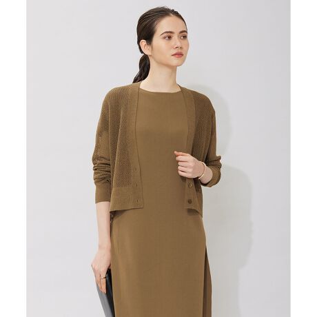 ■デザイン変形メッシュがニットならではの編柄カーディガン。軽くて透け感のある夏らしい素材ながら、コイルヤーンでモード感、高級感のある印象に。気負わずさらっと羽織れる様クロップトレングスに設定し、ボリュームのあるパンツルックスやワンピースにも合わせていただけます。インナーにタンクトップを着ていただくなど、クールでヘルシーなスタイリングもオススメです。