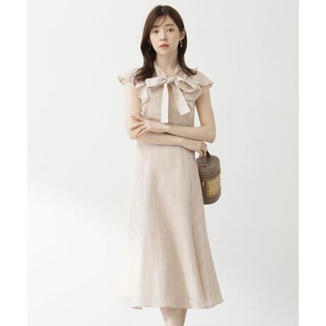 【商品特徴】シアーなチェック素材を使った大人かわいいリボンタイ付ワンピース。大胆なラッフルスリーブとリボンタイが、お顔周りを華やかな印象に見せてくれます。ウエストの下はすっきりとしたデザインなので、女性らしいメリハリのあるシルエットを演出。リボンタイは結んだまま、後ろファスナーで着脱がでます。【スタイリング】一枚でコーディネートが完成する時短ワンピースです。