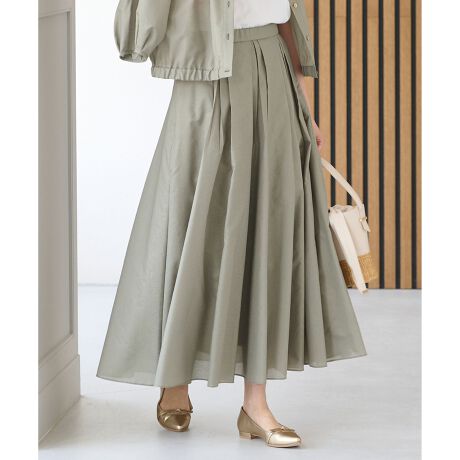 シアー素材とボリューム感が華やかなスカート■デザイントレンドのシアー素材のスカートです。裾に向かってたっぷりとボリュームを感じるようボックスタックを入れ、動くたびに裾がなびく華やかなデザインです。ウエスト周りはすっきりとしているので、着膨れせずに着て頂けます。程よい光沢感とほのかな陰影のある素材が、無地でありながらもコーディネートの主役になります。