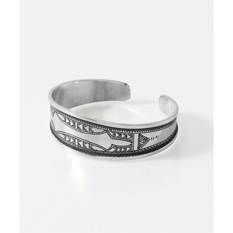 北アフリカの先住民族の言語で海を意味するモチーフ「Lbhar/ルブハー」というブレスレットです。 表面の文様は1刀1刀が手彫りで丁寧に彫られ、その文様にはそれぞれ意味があり、事物、物語、寓意などを象徴しています。 中央の文様とその周りに彫られた鱗のような細かい彫刻が特徴で、存在感のあるモデルです。一方で他のブレスレットと一緒につけてもバランスの良いボリューム感で、スタイルを選ばない使い勝手の良さも魅力的な商品です。