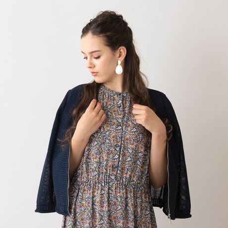 前中心はファスナータイプでちょっとカジュアルな雰囲気を楽しむことができます。七分袖なのでロングシーズン活躍。日焼け対策や冷房対策にも頼りになりそうなニットボレロです。