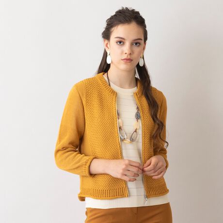 前中心はファスナータイプでちょっとカジュアルな雰囲気を楽しむことができます。七分袖なのでロングシーズン活躍。日焼け対策や冷房対策にも頼りになりそうなニットボレロです。