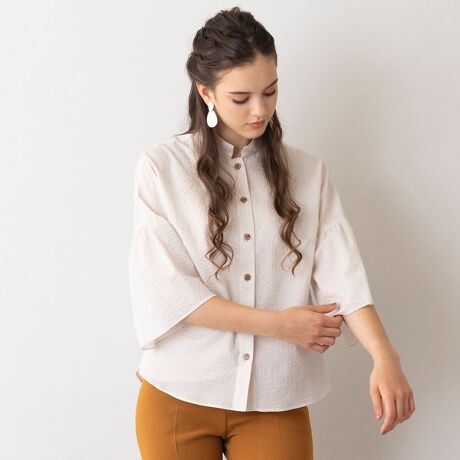 バンドカラーで華奢な首周りをカバーしつつ、ふんわりとしたフォルムが夏にピッタリ。フレアーを入れた袖も涼し気な印象です。