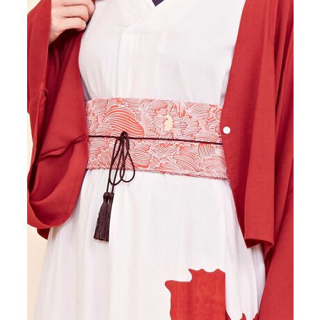 通常の帯より半分ほどの幅で、長さも胴を1周半して紐を結んで留めるタイプだと思うのですが、紐だけではとまりません。紐が解けやすくてすぐずり落ちるので、ワニ口のヘアクリップでの固定必須で着用しています。クリップ隠しのため羽織は要ると思います。