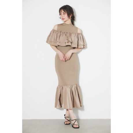 【自由自在にフリルを楽しめるマーメイドニットワンピース】【Design】裾がサテンのノースリーブのニットワンピースに別付けSETのフリルを重ね付けし、ふわっと揺れるフリル感が女性らしさを演出するワンピース。別付けのフリルはオフショルダーにしたり片腕を通してワンショルダーにして着用しても印象が変わります。またバックにはリボンデザインを施しているので後ろ姿も素敵です。もちろんお好みでリボンを前にしても!自由自在にフリルを使って着方を楽しめる1枚です。【Color】セクシーな大人の色気漂うBLK、やわらかい印象のBEG、大人可愛いPINK、春夏らしいバイカラーが爽やかなMINTの4色展開です。