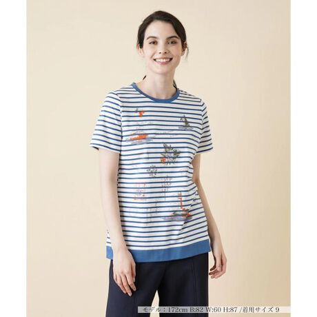 これからの季節らしいヘルシーなボーダー柄に、ヨットやハイビスカス、灯台といったバカンスな雰囲気溢れる手描きタッチのイラストを重ねた半袖Tシャツ。肌当たりのよいコットン生地を使用し、快適な着心地を叶えました。すっきりと着こなせるベーシックなシルエットだからカーディガンとのレイヤードにもぴったりです。------------------------------------夏ありありなしやや薄手ウォッシャブル(手洗い可)なし-------------------------------------※商品の色味は、撮影場所や光のあたり具合、お客様のお使いの機器により色味が違って見える場合がございます。予めご了承ください。※定価(税込)は、2023年06月29日のセール開始前の店舗における販売価格です。 ■□Leilian WHITE LABEL(ホワイトレーベル)・・・実力派デザイナーとの協業で、ベーシックな商品によりトレンド性を取り入れたブランドです。□■