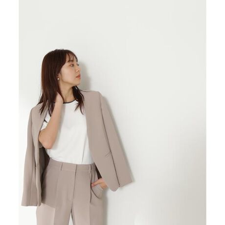 [design & styling]シンプルなノーカラーデザインのジャケットはオフィスシーンのワードローブに1枚は揃えておきたいアイテム。フロントはフックの仕様にし、ミニマルで洗練された印象に。袖口のスリットは折り返して着用可能な為、季節の変わり目にも着やすいデザインなのも嬉しいポイント。同シリーズのパンツとのセットアップでの着用がおすすめです。ボタンすべて開けることができます。[fabric]ドライタッチで夏場は勿論、シーズンレスで着やすく、程よいハリ感がありシワにもなりづらい素材。縦に少しストレッチが効いており、ストレスフリーな着心地なのもポイントです。※背裏、袖の裏地あり※キャメルベージュは限定店舗とSANEI bd ONLINEのみで展開の限定商品です。■シリーズパンツ[品番:0173230620] ※モデルの着用画像の場合、光の当たり具合により、実際の色味と異なって見えることがございます。色味は、商品単体の画像をご参照ください。