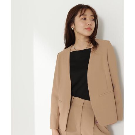 [design & styling]シンプルなノーカラーデザインのジャケットはオフィスシーンのワードローブに1枚は揃えておきたいアイテム。フロントはフックの仕様にし、ミニマルで洗練された印象に。袖口のスリットは折り返して着用可能な為、季節の変わり目にも着やすいデザインなのも嬉しいポイント。同シリーズのパンツとのセットアップでの着用がおすすめです。ボタンすべて開けることができます。[fabric]ドライタッチで夏場は勿論、シーズンレスで着やすく、程よいハリ感がありシワにもなりづらい素材。縦に少しストレッチが効いており、ストレスフリーな着心地なのもポイントです。※背裏、袖の裏地あり※キャメルベージュは限定店舗とSANEI bd ONLINEのみで展開の限定商品です。■シリーズパンツ[品番:0173230620] ※モデルの着用画像の場合、光の当たり具合により、実際の色味と異なって見えることがございます。色味は、商品単体の画像をご参照ください。