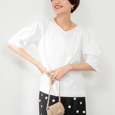 Vネックのシンプルなデザイン。袖口のパールが可愛いです。ストレッチがきいて着心地良いです。