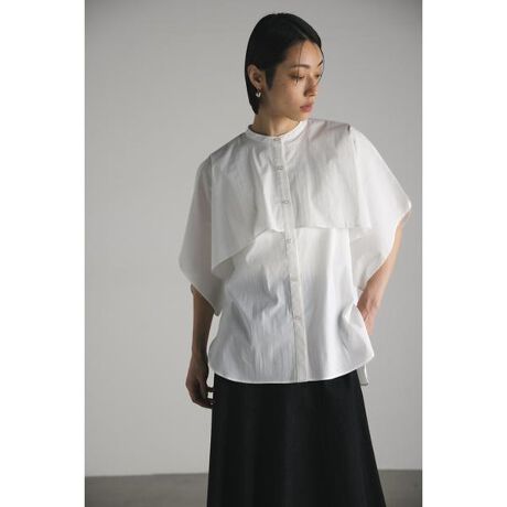 モデル身長168cm(FREEサイズ着用)動きのあるケープデザインをレイヤードさせたモードシャツ。ヒップまで隠れる着丈でスタイリングしやすい一枚です。ケープ端に小さいスナップを施し、腕を通したり垂らしたりと様々なシルエットが楽しめます。透け感WHTややあり、ストレッチなし。【お手入れ方法】マシンウォッシュ可
