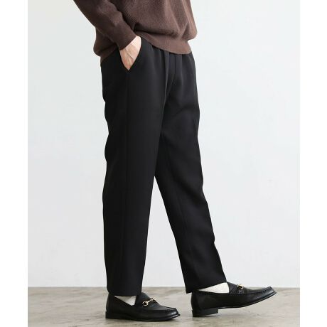 裾に向かって細くなるテーパードシルエットを採用しており、脚をすらっと綺麗に見せてくれるのが特長です。脚のラインを拾わないゆったりとしたサイズながらも、カジュアルになり過ぎない上品なルックスに仕上げました。また、腰部分にゴムウエストを採用したイージー仕様で、締め付け感がなく脱ぎ穿きもスムーズ。内側には紐も施されているため細かい調整が可能です。ベルトループを配しているのでタックインがしやすく、トレンド感のあるキレイめスタイルもかっこよく決まります。