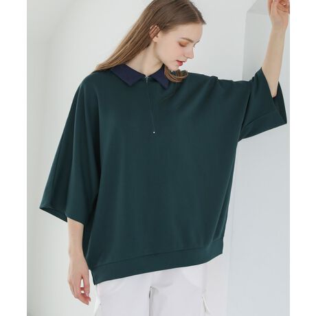 襟付きハーフジップ半袖ポンチドルマンプルオーバー