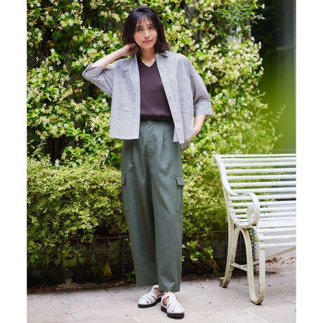 ・カジュアル過ぎないデザインの大人のカーゴパンツ・脇のカーゴポケットは少し低めの位置に設定することで、こなれた印象に・ウエスト部分はゴム仕様なので、快適な着心地