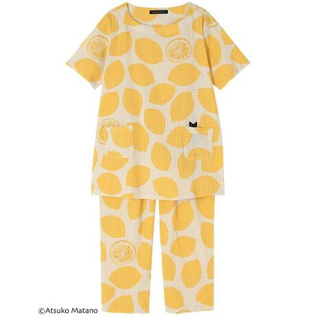 【パジャマ(5分袖8分丈パンツ)】クリエーター“俣野温子”氏がデザインする、甘くなりすぎない大人かわいいテキスタイルとカラーで、くつろぎ時間を楽しく過ごせるパジャマ&ルームウェア凹凸があるので肌ばなれがよく、夏にさらっとここちよい、ボイルシャーリング素材です。夏らしい檸檬の柄をプリントで表現しました。ポケットから顔をのぞかせている黒猫のアップリケがデザインのポイント。※アイテムによって柄の出方が異なりますのでご了承ください。【サイズ詳細】M:バスト107.0cm 着丈72.0cm ズボン脇丈82.0cm ウエスト58.0cmL:バスト115.0cm 着丈72.0cm ズボン脇丈82.5cm ウエスト63.0cmLL:バスト123.0cm 着丈73.0cm ズボン脇丈83.0cm ウエスト68.0cm3L:バスト131.0cm 着丈74.0cm ズボン脇丈83.5cm ウエスト73.0cm4L:バスト139.0cm 着丈75.0cm ズボン脇丈84.0cm ウエスト78.0cm※出来上がり寸法を表示しております。※サイズ詳細の寸法には多少の差異がございます。