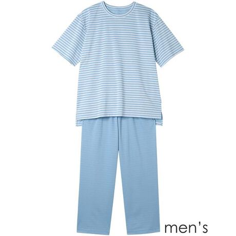 【メンズパジャマ(5分袖9分丈パンツ)】”眠る時間を、夢の時間に”睡眠が豊かになれば、毎日の暮らしはもっと活力に満ちたものになる。”眠る時間を、夢の時間に”をコンセプトに、「動きのここちよさ」「温度のここちよさ」「肌へのここちよさ」を考えたパジャマをはじめ睡眠アイテムを幅広くそろえ、喜びあふれる明日へと導きます。汗を素早く吸い上げて生地表面へ拡散させることで肌のべとつきを軽減、肌にはりつきにくいさらっとした着用感です。優れた吸汗速乾性があり、夏にオススメの素材です。【サイズ詳細】M:チェスト112.0cm 着丈72.0cm ズボン脇丈92.0cm ウエスト66.0cmL:チェスト120.0cm 着丈77.0cm ズボン脇丈97.5cm ウエスト72.0cm※出来上がり寸法を表示しております。※サイズ詳細の寸法には多少の差異がございます。