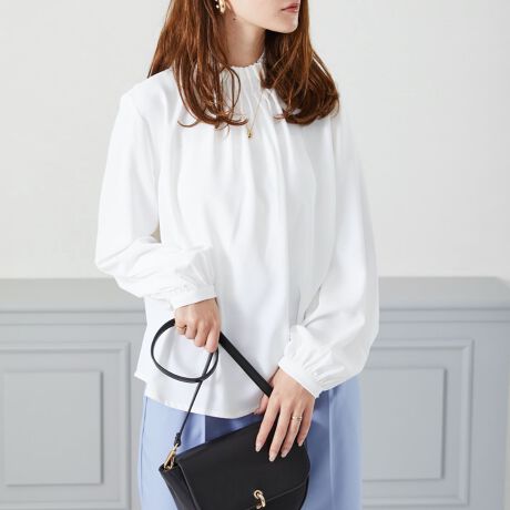 顔回りを華やかに見せてくれるタックディテールのブラウスはゆったりとしたシルエットにきゅっと締まる袖口デザインで上品に仕上げてくれる1枚。