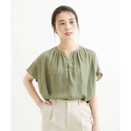 ネック周りのギャザーとフロントの釦ディティールがポイントの半袖ブラウス。釦は第二釦までが開くようになっていて、それ以下は飾り釦で肌が見えすぎないようなデザインになっています。