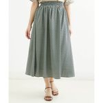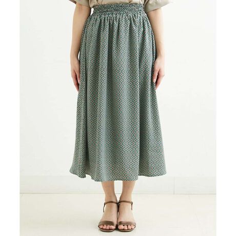 細かな幾何柄のスカート。広がり過ぎないシルエットは大人がちょうどよく着こなせます。オールウエストゴム仕様でストレスフリーな着心地も嬉しい。