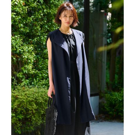 パンツスタイルやワンピースにプラスしたいロング丈ジレ■デザインストレートシルエットですっきりと着やすいジレです。衿端のサテン地がエッジを縁取り、さりげなく華やかな印象になります。長めの丈がIラインを強調してくれるので、スタイルアップ見えします。麻の質感が夏らしく、パンツスタイルやワンピースにプラスワンしてお洒落に決まるアイテムです。■素材テンセルとフレンチリネンを組み合わせた清涼感のあるストレッチ素材。サラッとした麻のタッチや表情はありながらも、テンセルのしなやかさや、しっかりとしたストレッチ性が着心地の良い素材です。