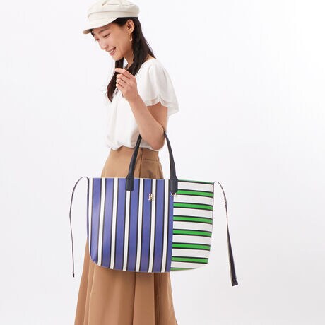 [型番:AW14766]ストライプミックスの切り替えがコーディネートに映えるトートバッグ。マチ部分に配したロゴテープをトップサイドから垂らして動きをつけ、前面にはメタルのモノグラムをあしらいました。内外に備えたリングカンには付属のミニポーチを装着することができます。
