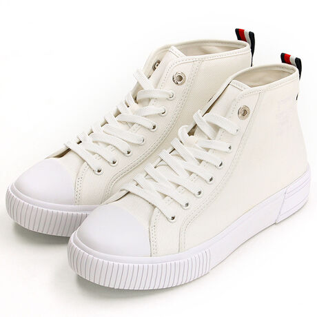 バルカナイズ製法で作られたハイカットスニーカー。デニム地をアッパーに使用し、パイピングを加えて耐久性を高めています。サイドのモノグラム刺繍をはじめ、バックのブランドロゴやグローバルストライプのプルストラップなど、随所にアクセントを効かせました。