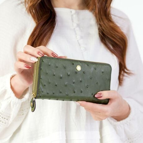 キーホルダーとマスクホルダーが加わり、5点セットへリニューアル!独特のクイルマークが特徴で、軽さと柔らかさを両立した高級皮革の代名詞であるダチョウの革、オーストリッチレザーを使用したラウンド型財布<リッコR>。内側のカードポケット12個の他に、同じオーストリッチレザーでつくられたカードが6枚収納できるカードケースとコインケースもついているため、機能性も抜群です。一緒にご使用していただくと統一感がでてオシャレにお持ちいただけます。
