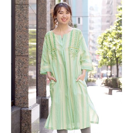 深い味わいを感じるカラーリングの生地は綿100で、さらりと着られます。