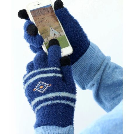ボーダーと刺繍を組み合わせた、寒色使いのふわふわ手袋。