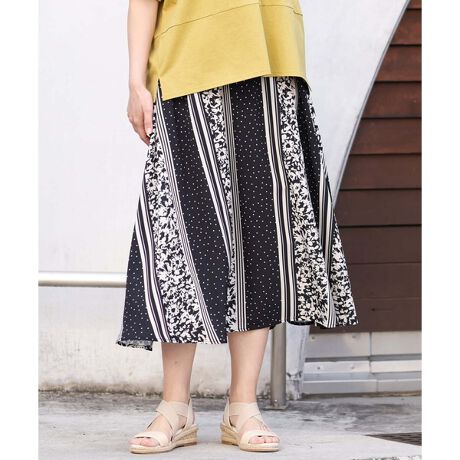 盛夏にむけてピッタリなドットとストライプフラワーを掛け合わせたパネル柄のフレアースカート。