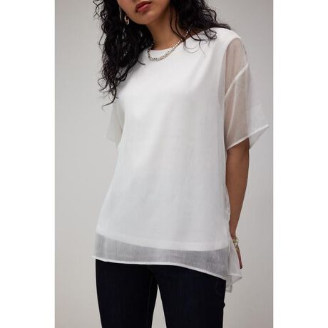 2023 Spring&Summer item ・ 布帛部分はポリエステル楊柳で縦シワがあり、表面変化ある生地になっています。 ・シアー素材を使用していて、インナーは肌さわりのいいカットソーです。 ・今期トレンドのシアーを使ったデザイントップスです。 ・オーバーなシルエットのシアーTシャツにインナーがドッキングになったデザインです。 ・女性らしいシアー素材もカジュアルな印象で着こなせるように、ルーズな形にしました。 ・インナーがドッキングされているので、まるでタンクトップを重ねたようなデザイン。 ・インナーいらずで1枚で完成するデザインです。 ・ヒップも隠れる着丈なので、スキニーデニムなどで合わせてもスタイルアップが叶う。 ・ハイウエストのボトムスにはインしてももたつかないので安心して着用していただけます。 ・1枚着るだけでトレンドのスタイリングが完成します。