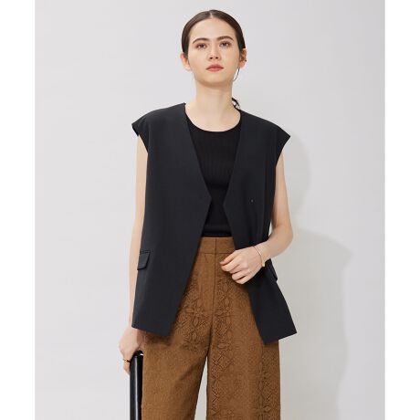 ■デザインTOPS感覚で着用できるジレ。ホックを留めても、外してサッと羽織っても決まります。同素材のパンツ合わせでセットアップでの着用もおすすめです。
