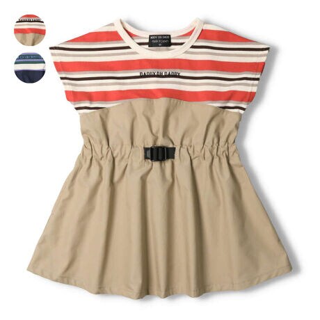 マルチボーダーのTシャツに布帛のスカートの切替デザイン。ロゴは刺繍になっています。飾りのベルトがアウトドアなイメージ。同じボーダーのTシャツ(V30806、V30807)の作りもあるので、兄弟姉妹やお友達と男女でアイテム違いでペア、リンクコーデ、お揃い、おそろいコーディネートも楽しめます!安心の日本製でギフトやプレゼントにもオススメ!【アイテム】半袖 トップス シンプル ガーリー フェミニン カジュアル お洒落 オシャレ かわいい 可愛い 普段着 デイリーウェア お出かけ着 お外着 お外遊び着 子ども こども 女児 女の子 ガールズ キッズ ベビーサイズ トドラーサイズ 幼稚園 保育園 小学校 通園 通学 小学生 2023年夏物新作 丸高衣料 ベージュ コン ネイビー 紺色 ダディオダディ コットン100% 綿100% made in Japan メイドインジャパン 国内生産