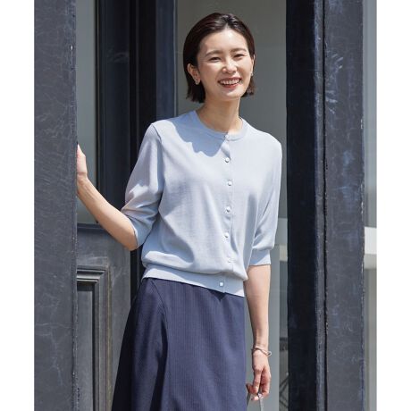 暑い夏の日除けや冷房対策にもおすすめな、ひじが隠れる5分袖のクルーカーディガン。アームホールにややゆとりを持たせ、フレンチスリーブなど袖デザインがあるトップスにも羽織りやすいサイズ感です。サイドの編地切り替えがすっきりと見せてくれるのもポイント。同素材の半袖ニットとセットで合わせたきちんと感のあるスタイリングもおすすめ。