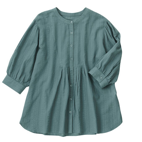 [型番:271373]【ポイント】・しっかり見えするバンドカラー仕様で、きちんとした着こなしに。・胸下部分にタックを施し、裾にかけて広がるAラインシルエットに仕上げました。・ふわりとした七分袖デザイン・身体のラインを拾わないゆるっとしたシルエットで体型カバーにもおすすめです。【素材】ぽこぽことした表面感が可愛い縦柄のドビー素材。程よい透け感があり、夏でも涼やかに着こなせます。