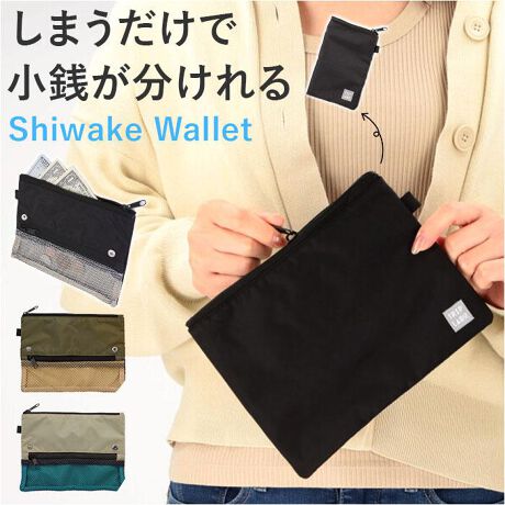 快適な旅のための便利アイテム!お会計時のプチストレスを解消する「仕分けウォレット」が新登場。【ファスナー開口】収納スペースの開口部はファスナー式。開閉しやすく、中身の取り出しもラクラク!【旅先でのお会計もスマートに】収納部が2スペースに分かれており、上部からお金を入れると小銭のみが下に落ちる!お札と小銭をサッと分けてくれる優れもの◎【カードも一緒に】お札収納スペースには、カードが2枚入るポケット付き。使用頻度の高いカードをIN。【中身を確認しやすい小銭入れ】下部の小銭収納スペースは、外側からも見やすいメッシュ仕様。【コンパクトに持ち運びOK】スナップボタンを留めれば、二つ折り仕様に!ミニバッグにもすっぽり収まるのが嬉しい♪【ジェンダーレスデザイン】年代・性別問わず持ちやすい、カジュアルデザイン!家族で兼用もOK。【ポケット仕様】お札収納スペース:カードポケット×2