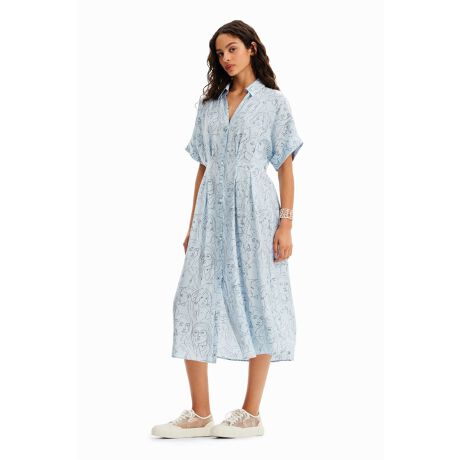 テクスチャーと光沢感のある素材で仕立てた、Vラインデコルテの半袖ミディシャツワンピース。ウエスト部分にダブルタックのディテール、そしてフェイスモチーフのプリントをあしらいました。