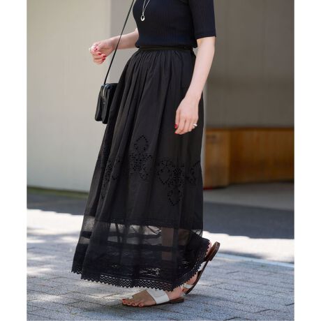 シーズンレスで着用できるコットンのレーススカートですが、夏から秋口までの暑さが厳しい時期に着たいTシャツのコーディネートを上品に仕上げてくれるアイテムです。