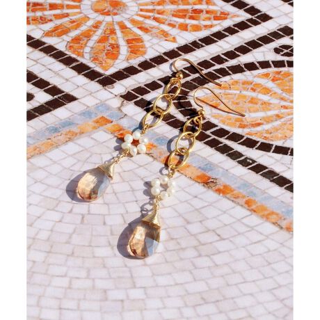 【チェーンデザイン】淡水パール×オレンジクリスタルピアス(ゴールドフィルド)